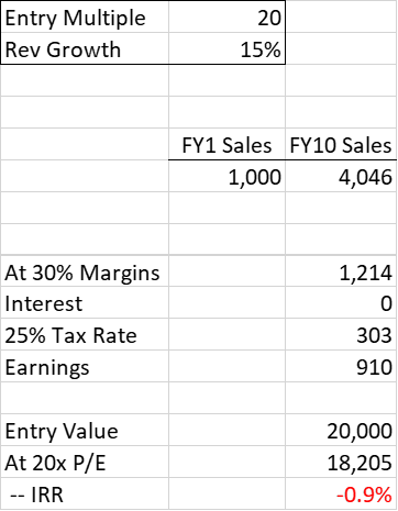 That’s actually very close to MSFT’s return in the 1990s. MSFT’s revenues went from $1.84B in 1991 to $25.3B in 2001, a 29.9% CAGR, and traded ~25-35x EPS in the early 2000s. By buying at 20x EV/Sales, bulls are basically saying, “I am long MSFT-type companies, and only MSFT-type companies, to achieve a 20% IRR.” If a company instead “only” achieves a 15% revenue growth rate, 30% margin, and a 20x P/E at exit, we lose money: