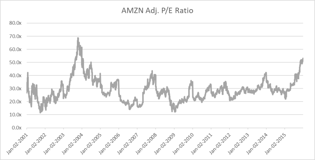 Back when I bought my (massively sized) AMZN investment, I created a general framework to assign AMZN a P/E multiple. At the time, given AMZN’s “everything store” approach, I thought of AMZN as WMT without the stores. I guessed that if it weren’t for all its growth investments, AMZN could at least achieve WMT’s margins plus 200bps. I then backed out taxes for a guess owners’ earnings. My reasoning was simple. Rent is typically 5-15% of sales for a retailer, plus AMZN had significant 3P revenues (EBAY at ~20% margins) and Prime subscriptions which I felt made my assumptions conservative. AWS was relatively small at the time, but I saw the opportunity and figured a business with significant software components could at least achieve WMT’s margins. However, given my concerns on eventual margins – at the time, renting a server seemed pretty commodity to me – I was humorously only willing to buy AWS “for free.” Applied retroactively, here’s the general look of my work: